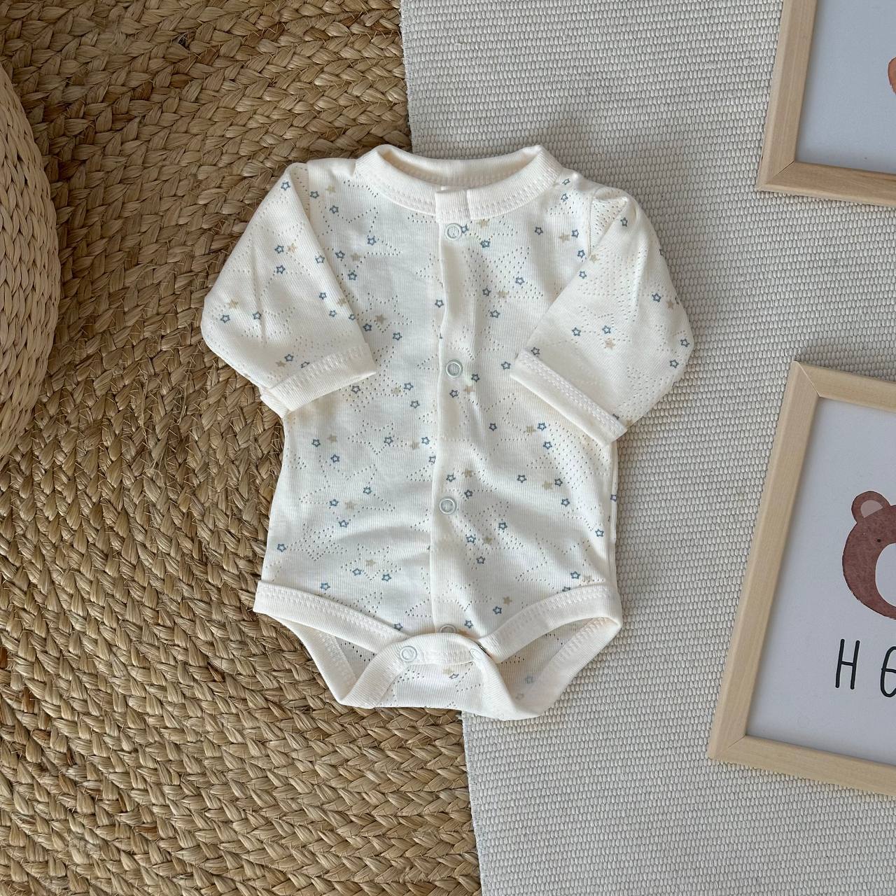 Боди имеет застежку на кнопки на плечике и снизу для смены памперса.