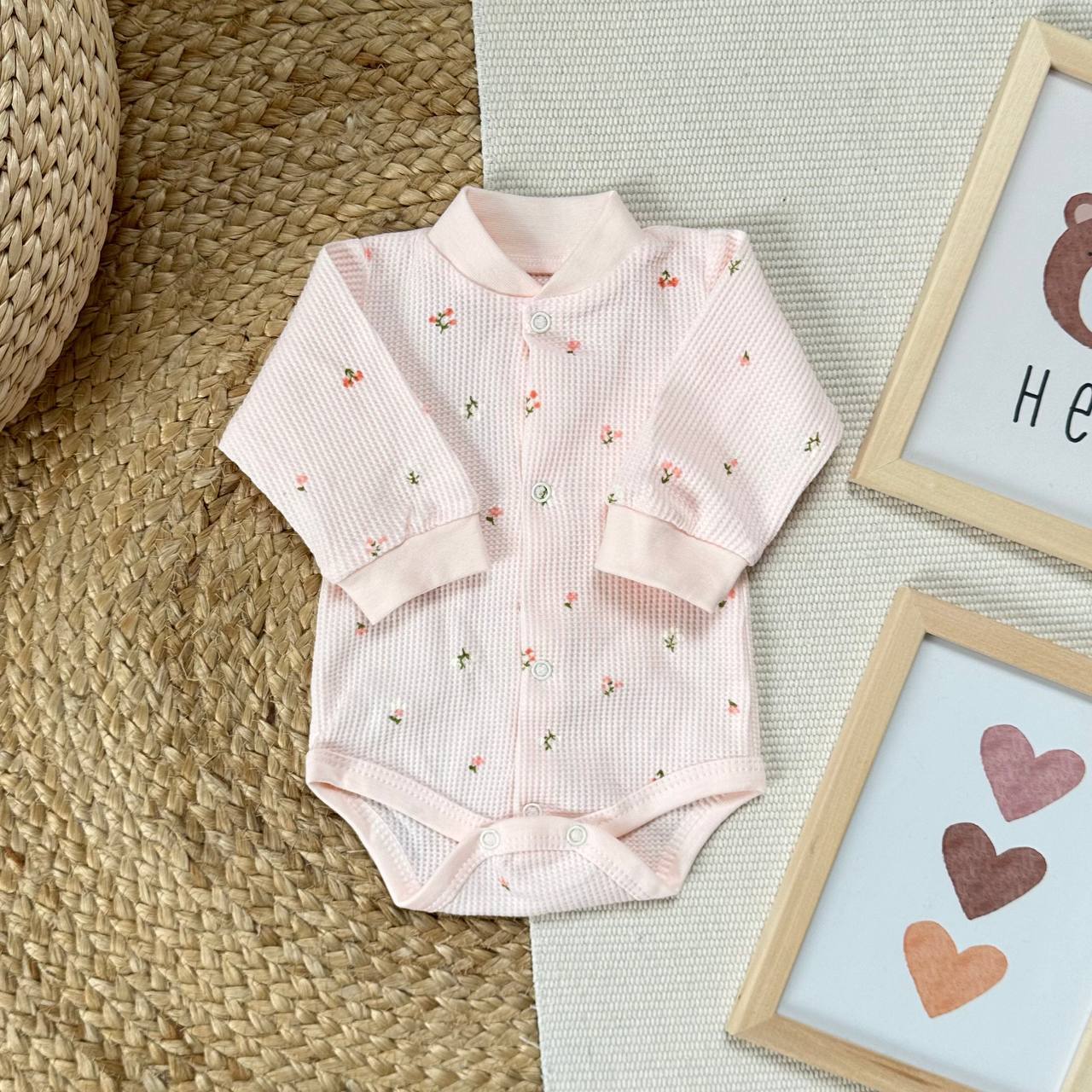 Боди имеет застежку на кнопки спереди и снизу для смены памперса.