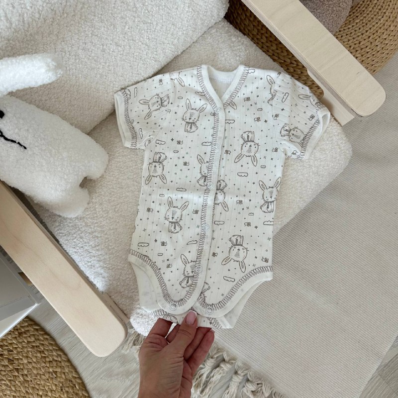 Боди имеет застежку на кнопки спереди и снизу для смены памперса.