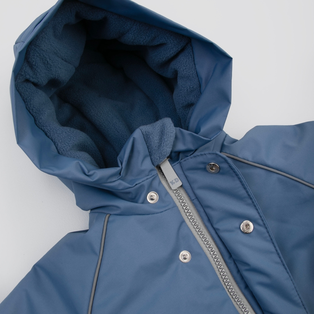 Капюшон с отворотом. Застежка молния с планкой, фиксируется на кнопки.