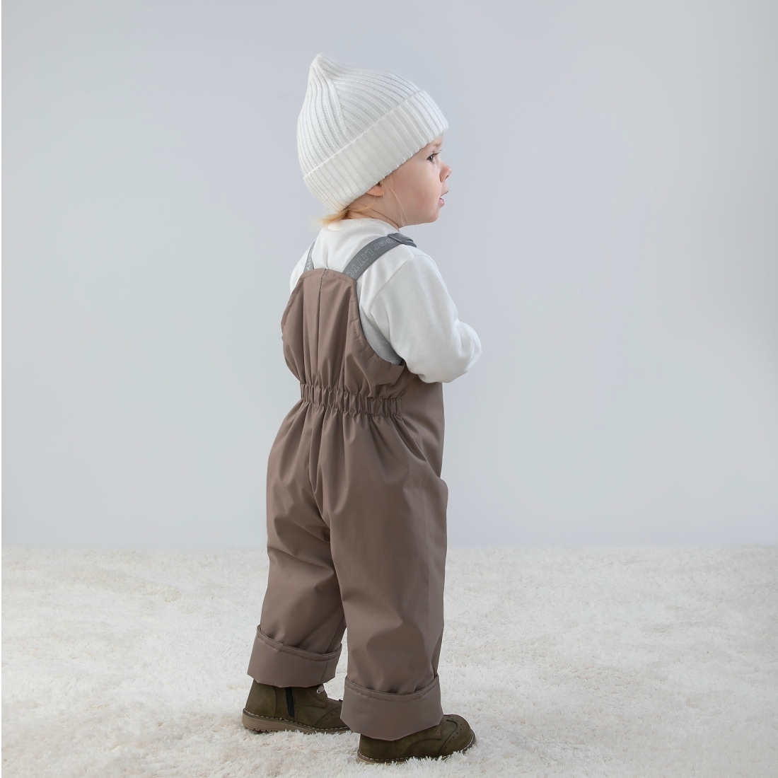 Полукомбинезон с отворотами, по спинке расположена резинка.