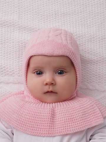 Двойная шапочка с расстегивающейся манишкой. Верхний слой шапки и манишка связаны из полушерстяной пряжи, нижний слой выполнен из трикотажного хлопкового полотна. Можно носить без чепчика. Мягкая резинка вокруг лица не вытягивается в процессе носки и плотно облегает лицо ребенка.