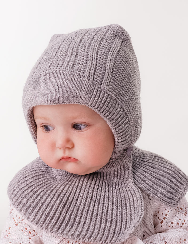 Двойная шапочка с расстегивающейся манишкой. Верхний слой шапки и манишка связаны из полушерстяной пряжи, нижний слой выполнен из трикотажного хлопкового полотна. Можно носить без чепчика. Мягкая резинка вокруг лица не вытягивается в процессе носки и плотно облегает лицо ребенка.