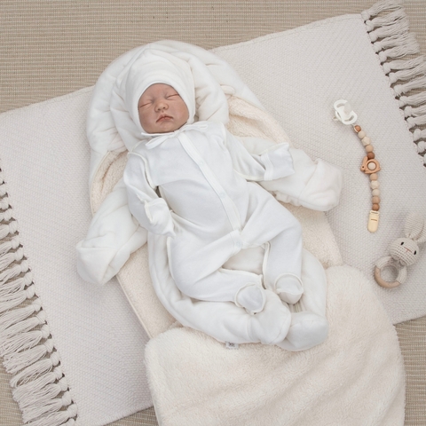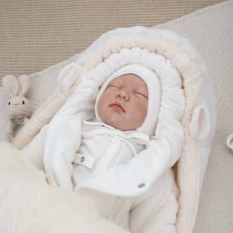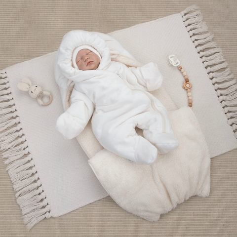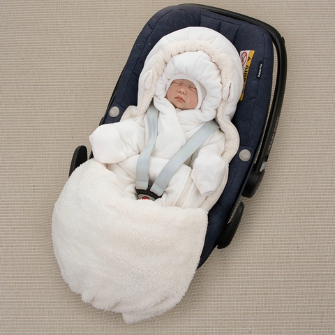 1. Конверт из плюша с подкладом из шерпы (две молнии по бокам для полного открытия конверта, утягивающая резинка по контуру капюшона, прорези для автокресла, защитные клапаны по краям молний)