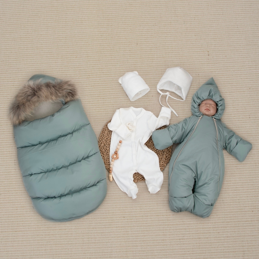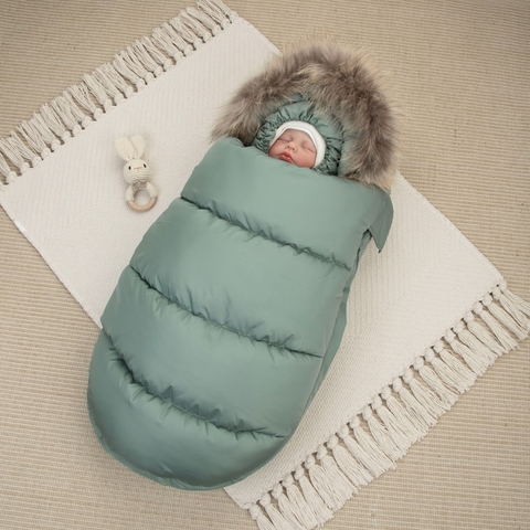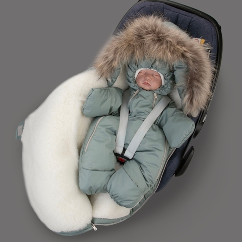 Конверта: ткань верха - непромокаемая ткань – ROYAL DEWSPO (п/э 100%), наполнитель – синтепон 200 г/м2. (п/э 100%), подклад – овечья шерсть + искусственный мех (70% мех 30% п/э).