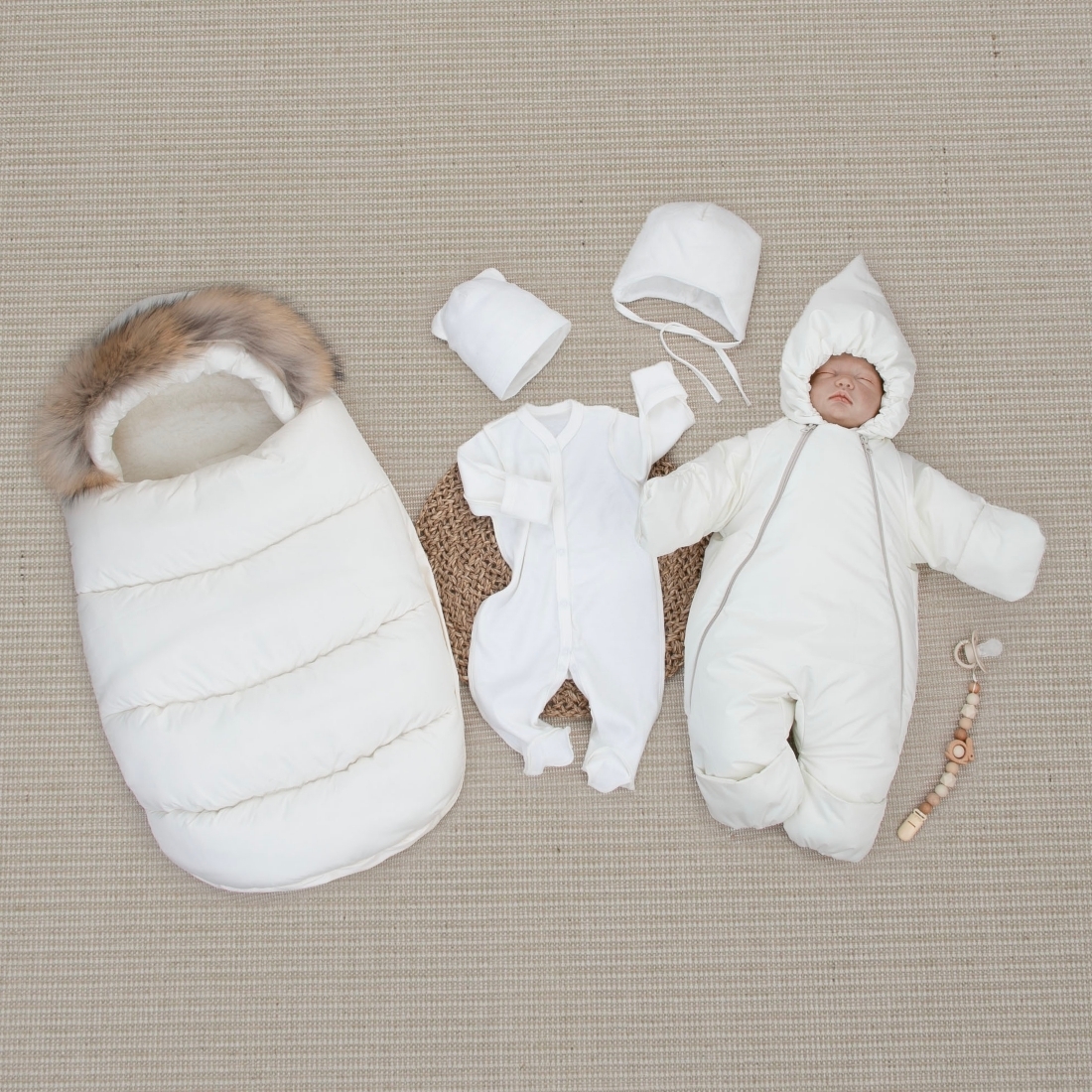 Конверта: ткань верха - непромокаемая ткань – ROYAL DEWSPO (п/э 100%), наполнитель – синтепон 200 г/м2. (п/э 100%), подклад – овечья шерсть + искусственный мех (70% мех 30% п/э).