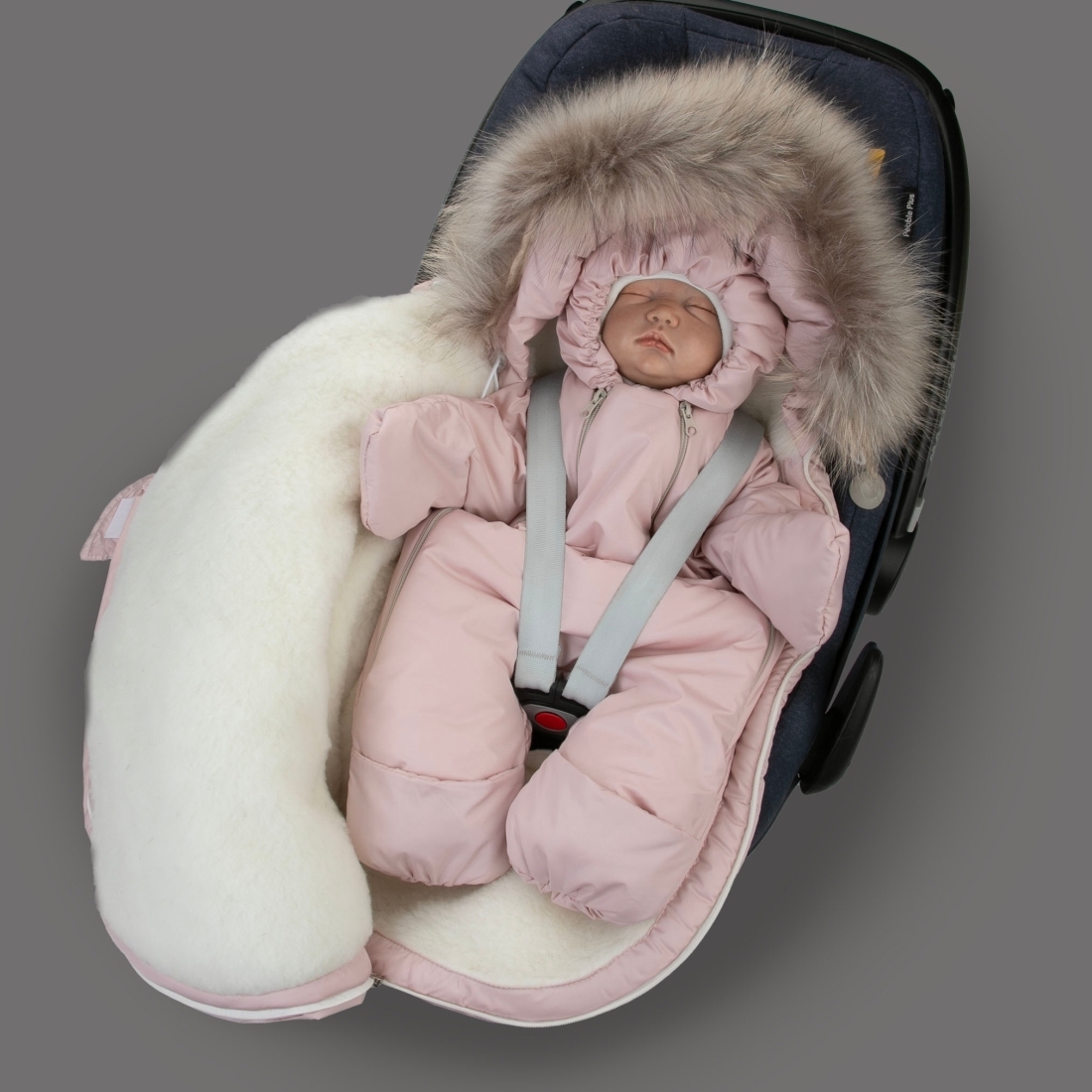 Конверта: ткань верха - непромокаемая ткань – ROYAL DEWSPO (п/э 100%), наполнитель – синтепон 200 г/м2. (п/э 100%), подклад – овечья шерсть + искусственный мех (70% мех 30% п/э).